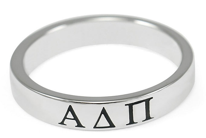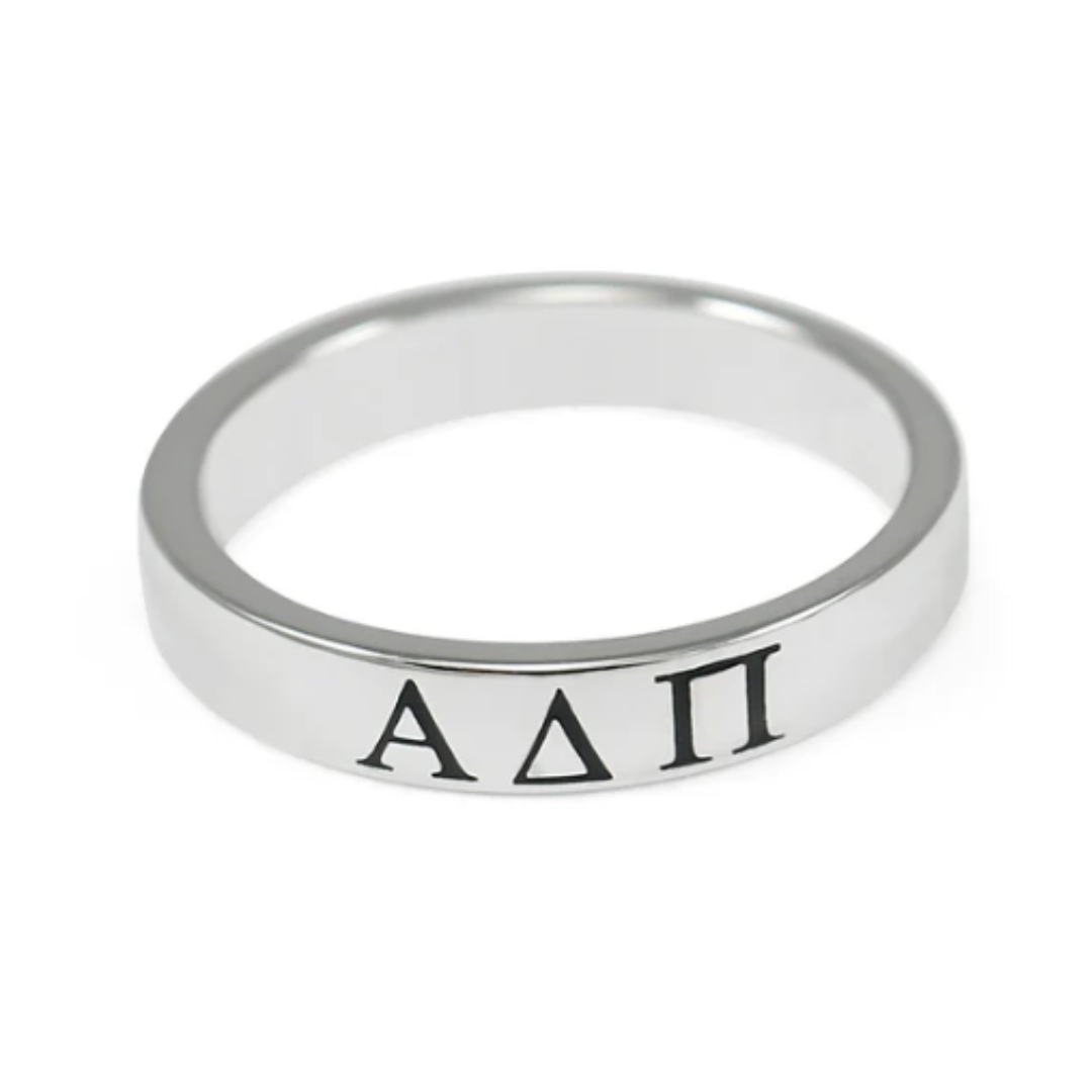 Alpha Delta Pi women sterling silver ring with Greek letters finished in black enamel. Coated with rhodium for a smooth and lasting shine.