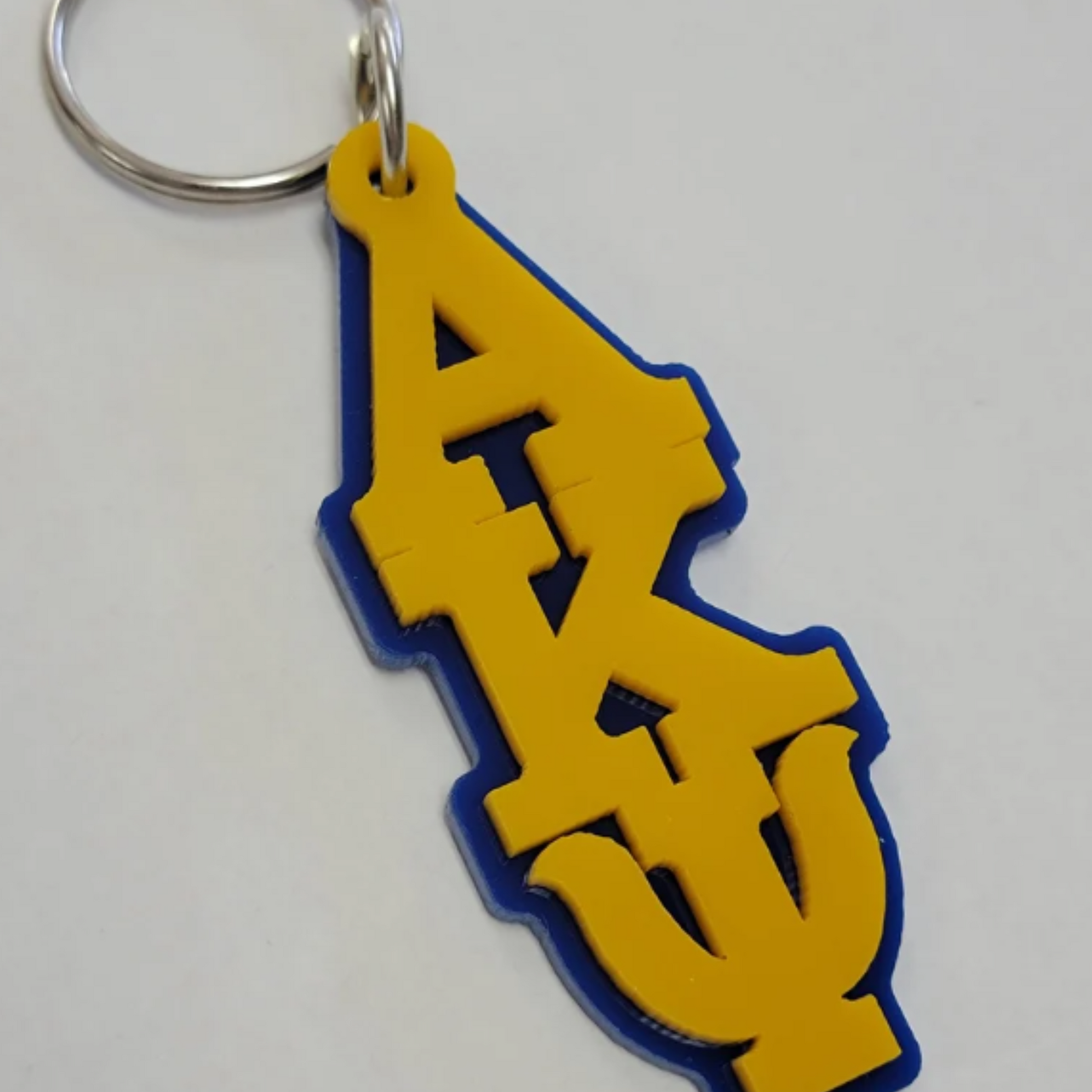Alpha Kappa Psi Fraternity Key Chain. Laser cut Greek letters on double layer hard plastic with Fraternity colors in mind.