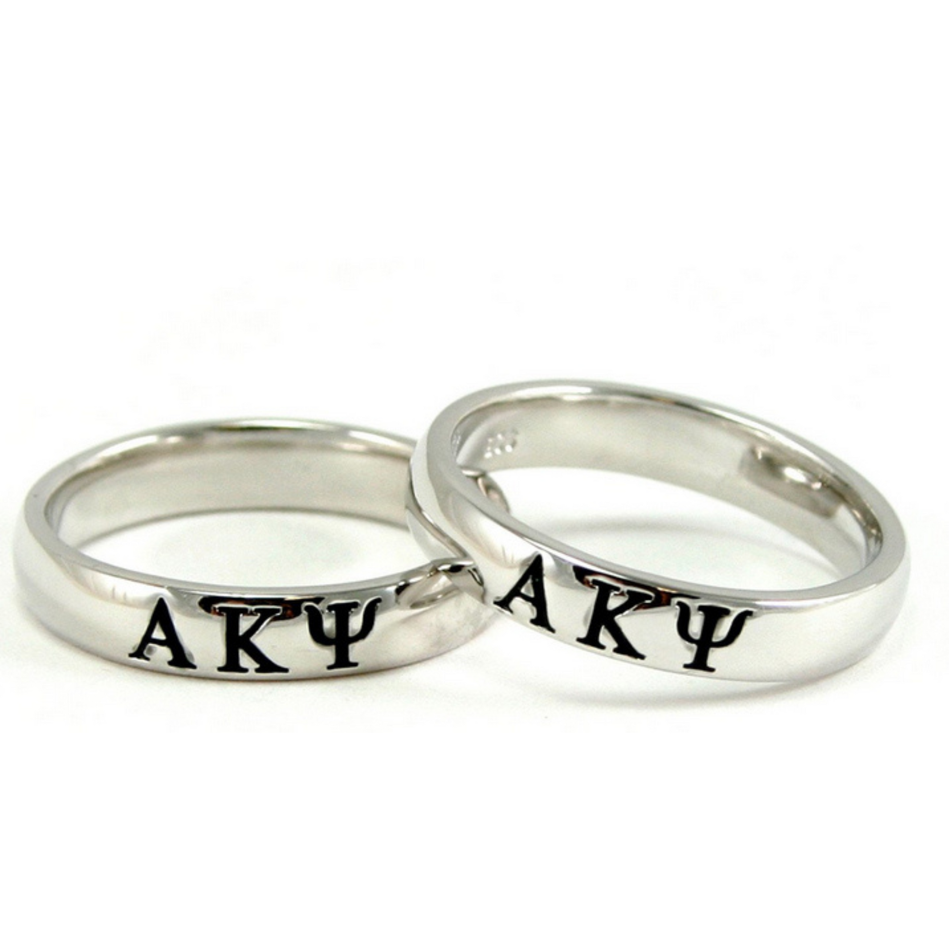 Alpha Kappa Psi women sterling silver ring with Greek letters finished in black enamel. Coated with rhodium for a smooth and lasting shine.