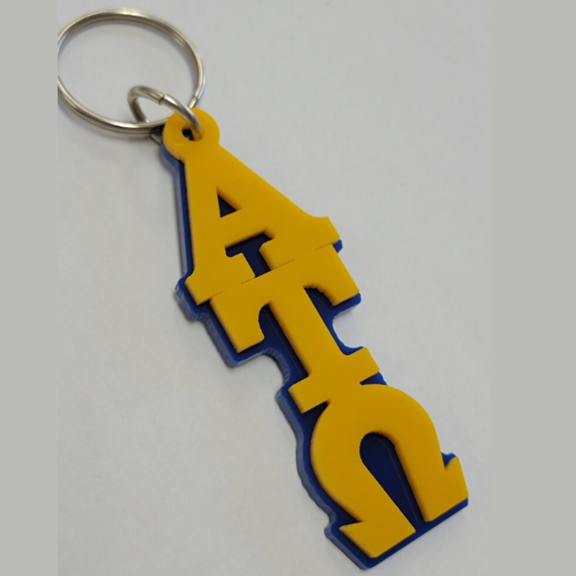 Alpha Tau Omega Fraternity Key Chain. Laser cut Greek letters on double layer hard plastic with Fraternity colors in mind.