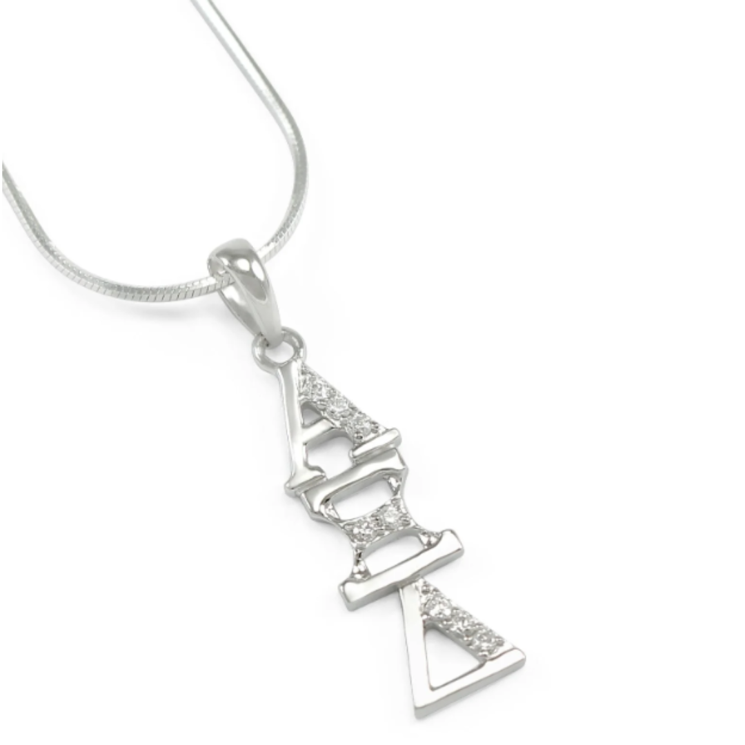Made out of sterling silver & lab created diamonds. It’s designed and created exclusively by our company, each letter is approximately 1/4″ tall and includes a chain loop, Silver Chain sold separately.