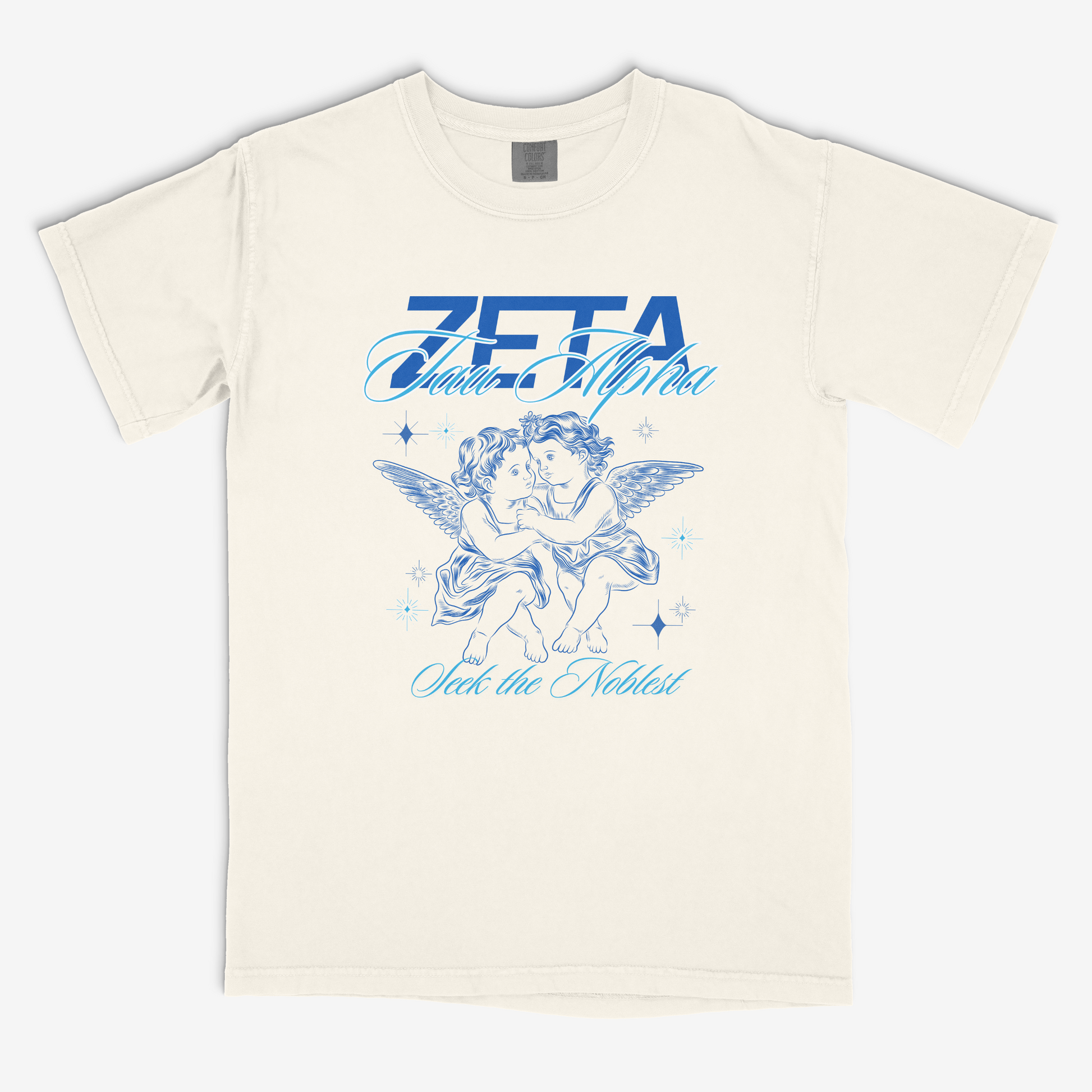 This unisex graphic tee features baby angels, celestial accents, and elegant text that's customizable. Available on your choice of Comfort Colors® for that soft, vintage-washed feel, or Gildan Heavy Cotton for a classic, structured fit. Perfect for recruitment, bid day, Greek Week, philanthropy events, or casual wear.