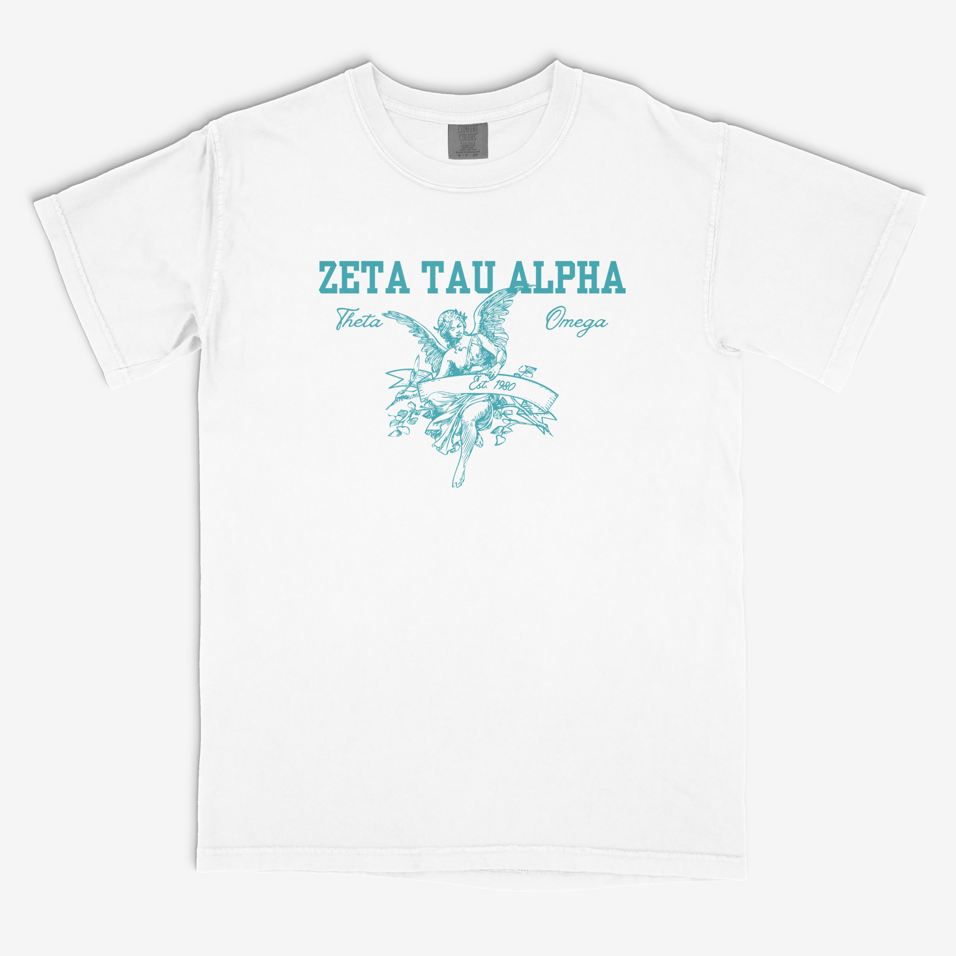 This unisex graphic tee features a cherub angel, classic banner, and collegiate text that's customizable. Available on your choice of Comfort Colors® for that soft, vintage-washed feel, or Gildan Heavy Cotton for a classic, structured fit. Perfect for recruitment, bid day, Greek Week, philanthropy events, or casual wear.