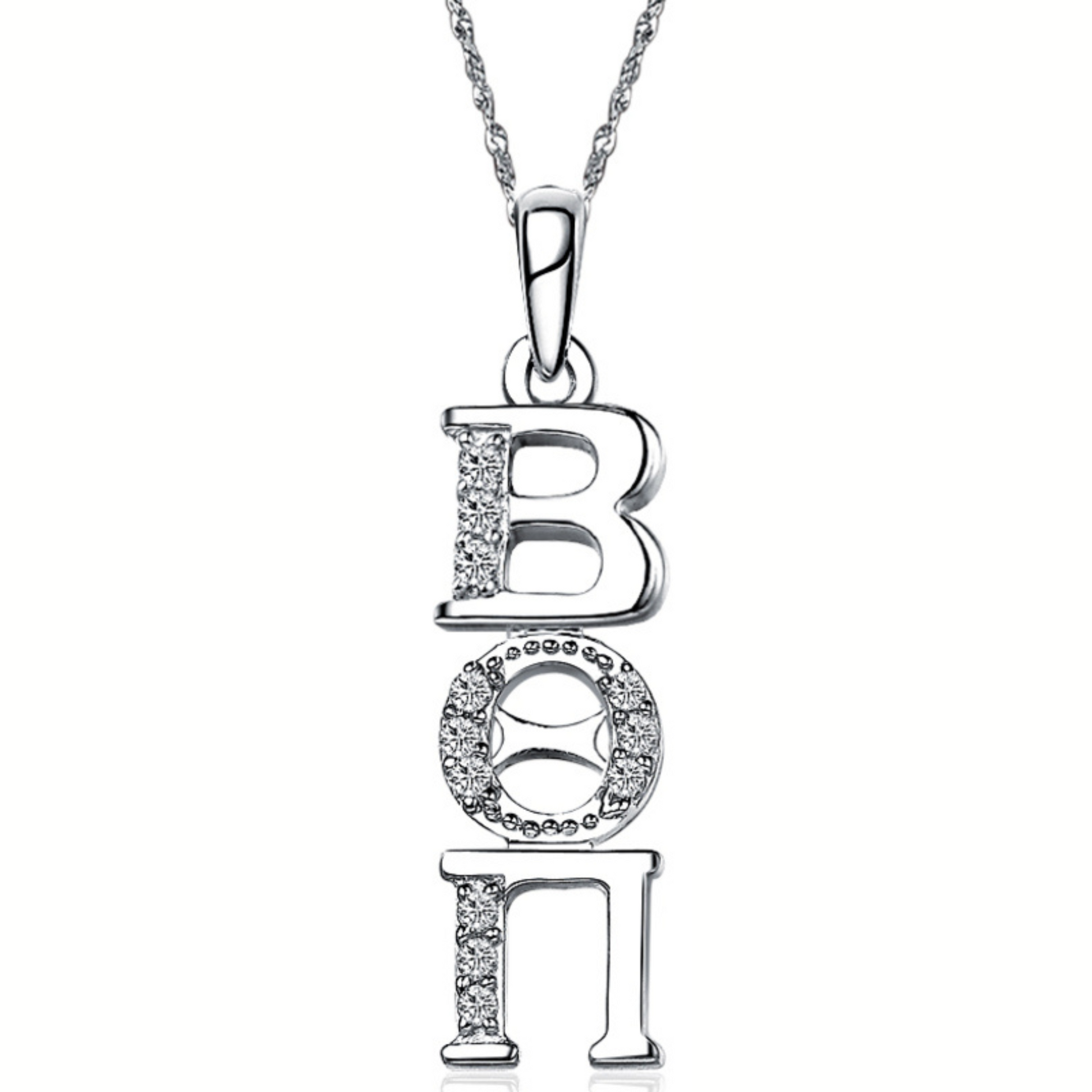 Made out of sterling silver & lab created diamonds. It’s designed and created exclusively by our company, each letter is approximately 1/4″ tall and includes a chain loop, Silver Chain sold separately.