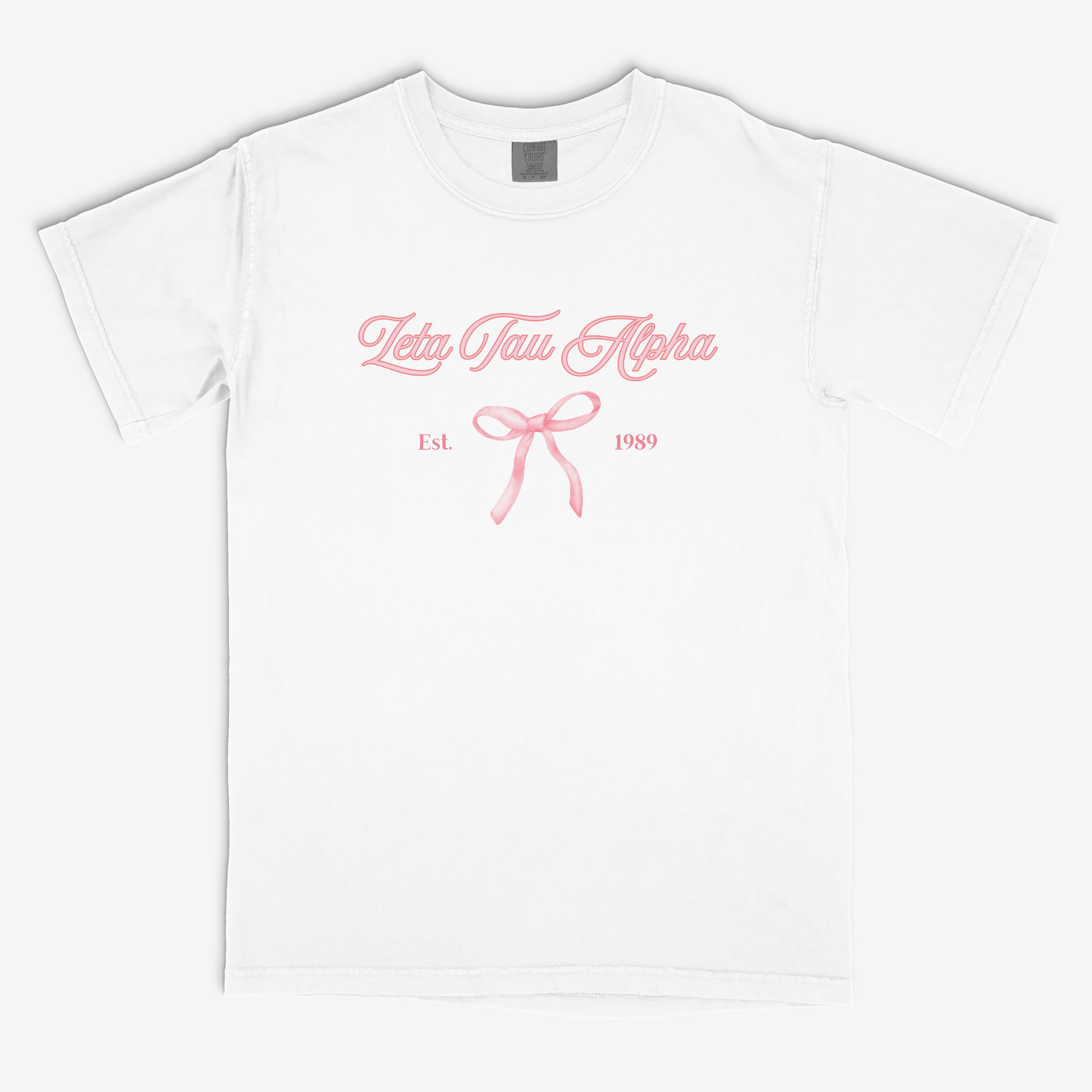 This unisex graphic tee features pink bow and script text that's customizable. Available on your choice of Comfort Colors® for that soft, vintage-washed feel, or Gildan Heavy Cotton for a classic, structured fit. Perfect for recruitment, bid day, Greek Week, philanthropy events, or casual wear.