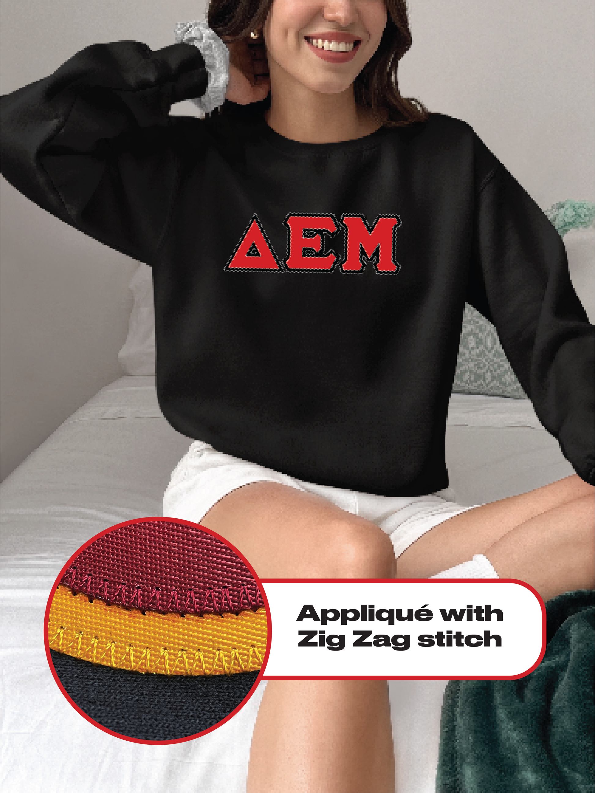 Delta Epsilon Mu crewneck sweatshirt letters // Delta Epsilon Mu zig-zag embroidered crewneck letters