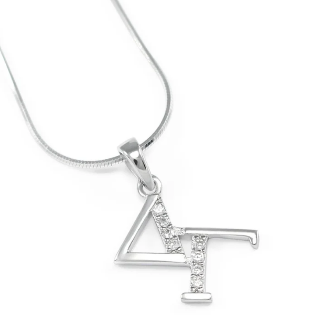Made out of sterling silver & lab created diamonds. It’s designed and created exclusively by our company, each letter is approximately 1/4″ tall and includes a chain loop, Silver Chain sold separately.