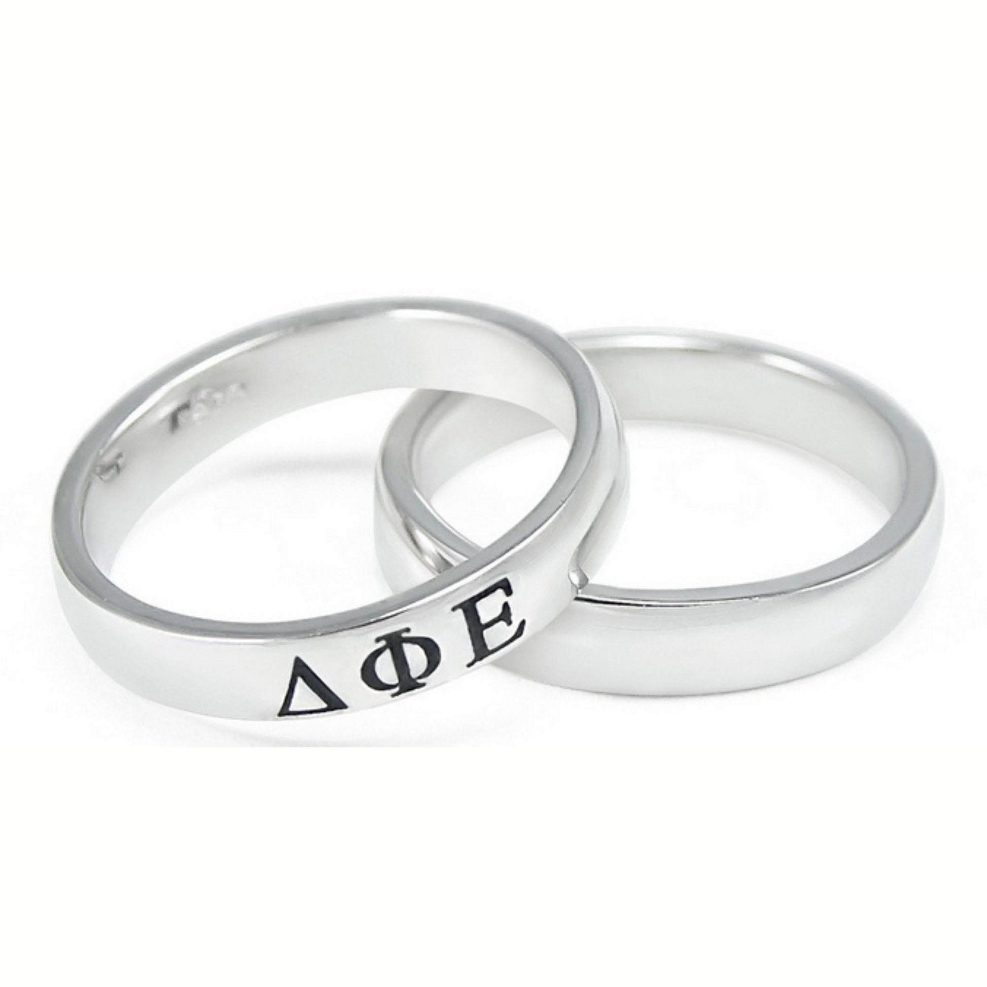 Delta Phi Epsilon women sterling silver ring with Greek letters finished in black enamel. Coated with rhodium for a smooth and lasting shine.