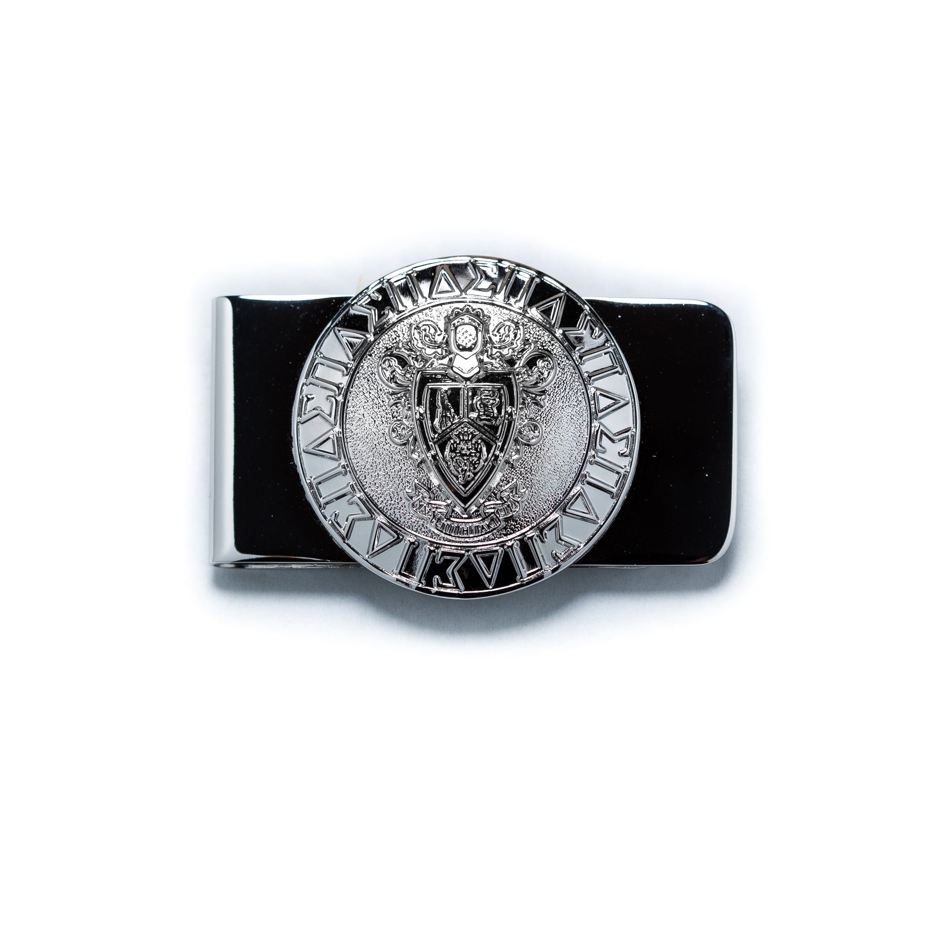 Rhodium Plated Delta Sigma Pi money clip with coat of arms surrounded with Greek letters.