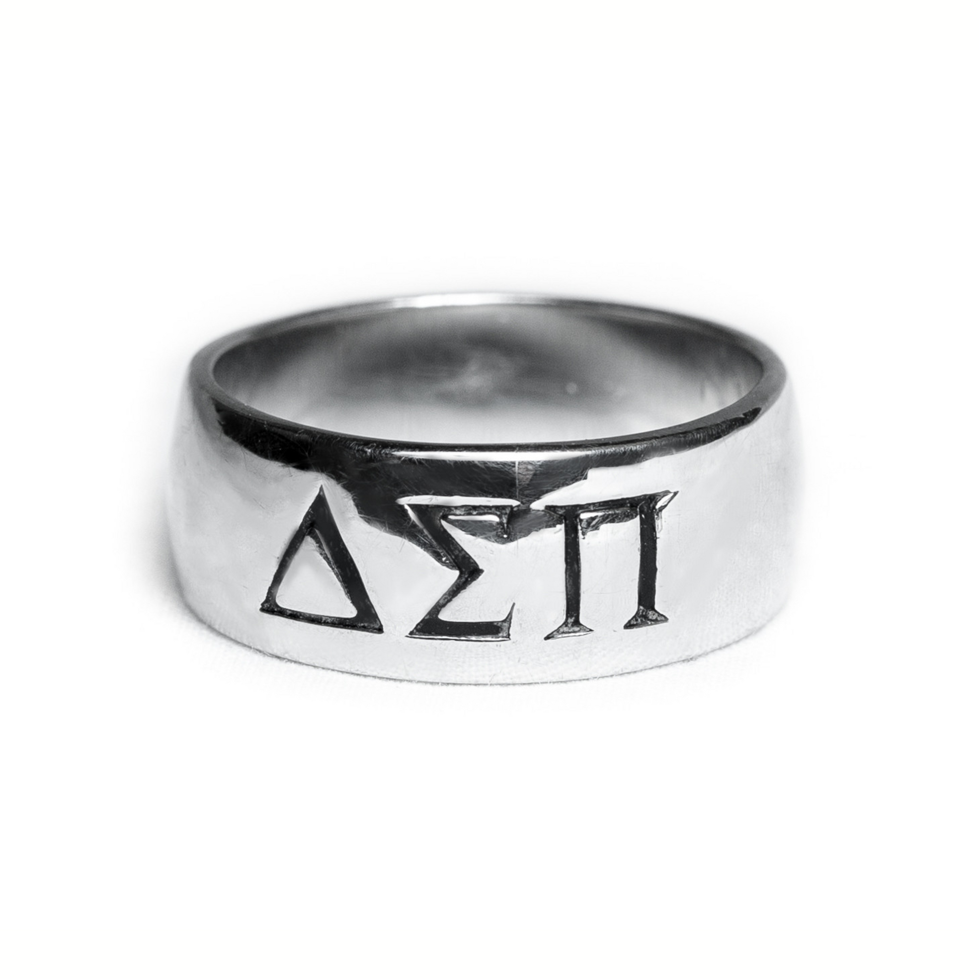 Delta Sigma Pi men sterling silver ring with Greek letters finished in black enamel. Coated with rhodium for a smooth and lasting shine.