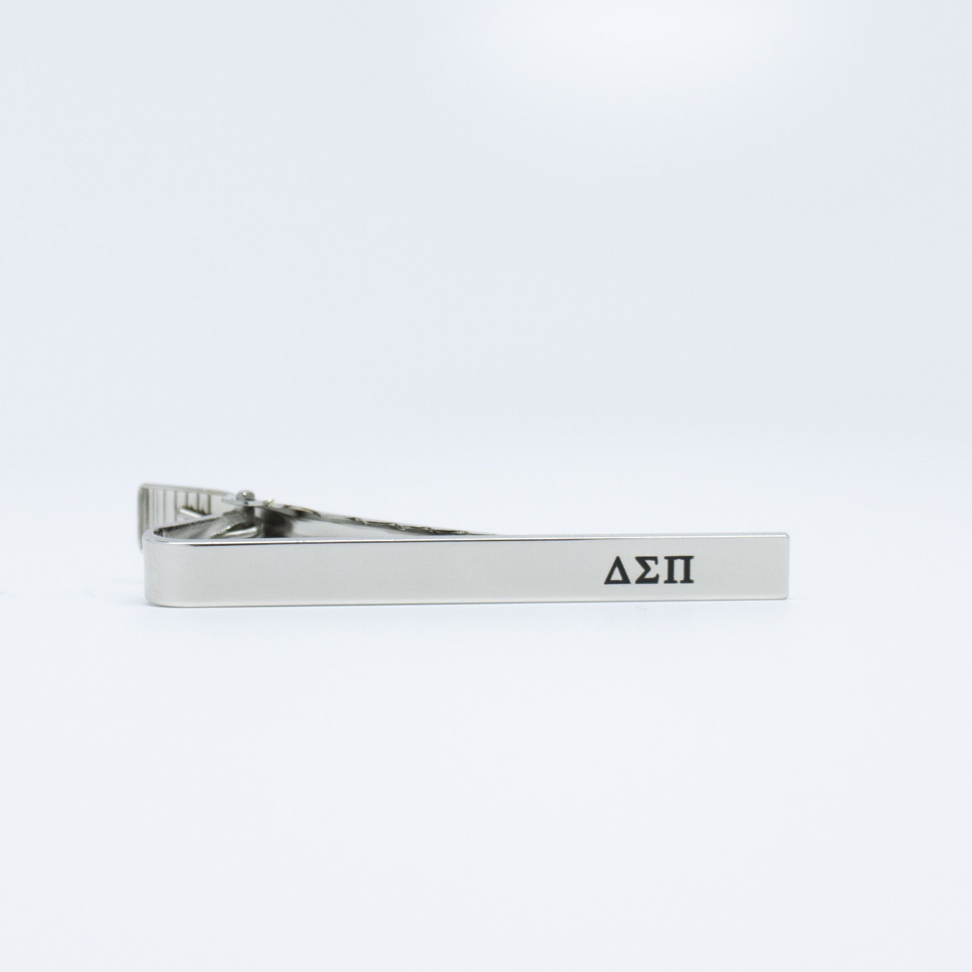 Delta Sigma Pi polished nickel finish Tie Clip with laser engraved Greek letters. Compliments any tie. Makes a great gift for any member.