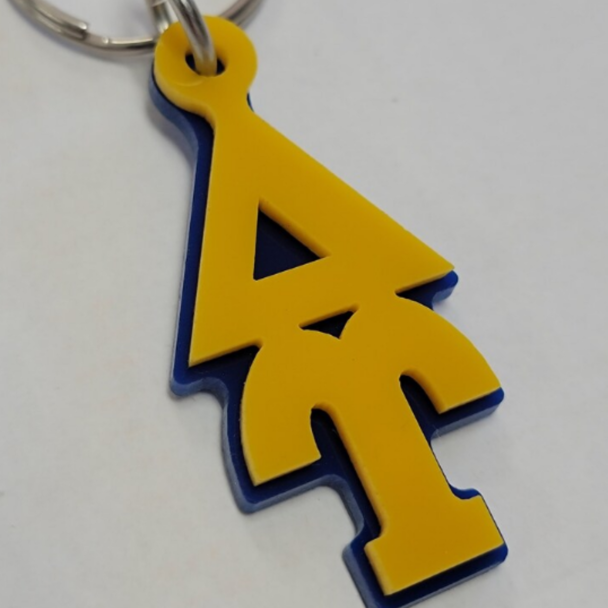 Delta Upsilon Fraternity Key Chain. Laser cut Greek letters on double layer hard plastic with Fraternity colors in mind.