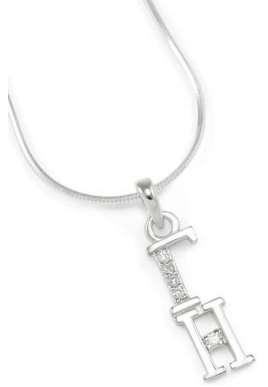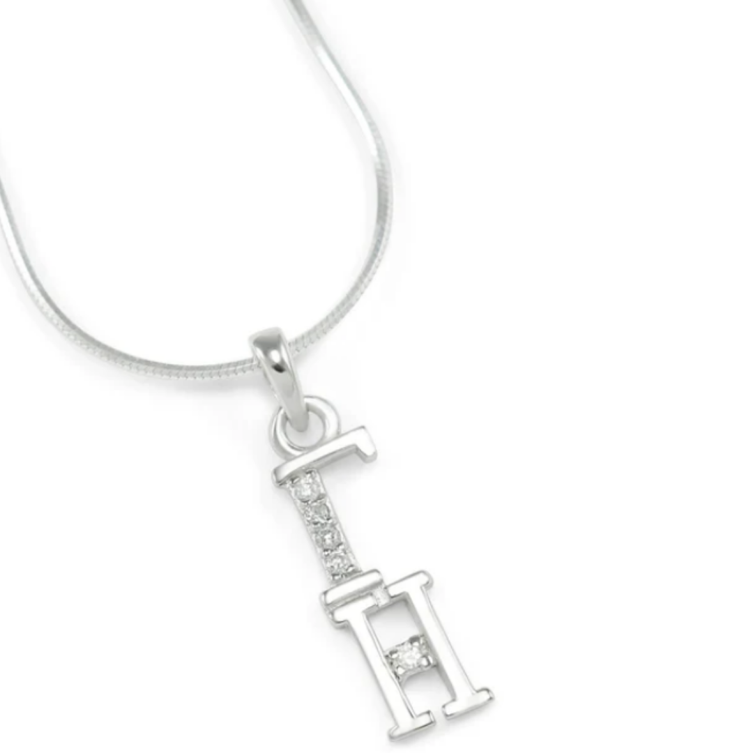 Made out of sterling silver & lab created diamonds. It’s designed and created exclusively by our company, each letter is approximately 1/4″ tall and includes a chain loop, Silver Chain sold separately.