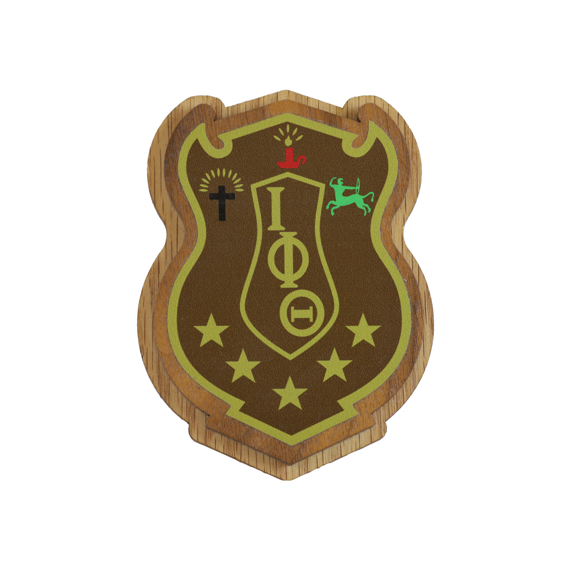 Organization raised wood crest with 3m tape adhesive backing for easy application to any paddles, doors or boxes. Holds just as good as glue when applied to a clean smooth surface.