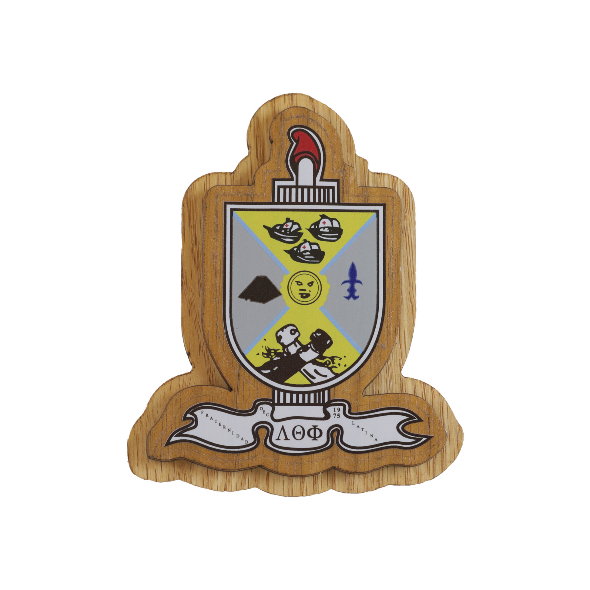 Organization raised wood crest with 3m tape adhesive backing for easy application to any paddles, doors or boxes. Holds just as good as glue when applied to a clean smooth surface.