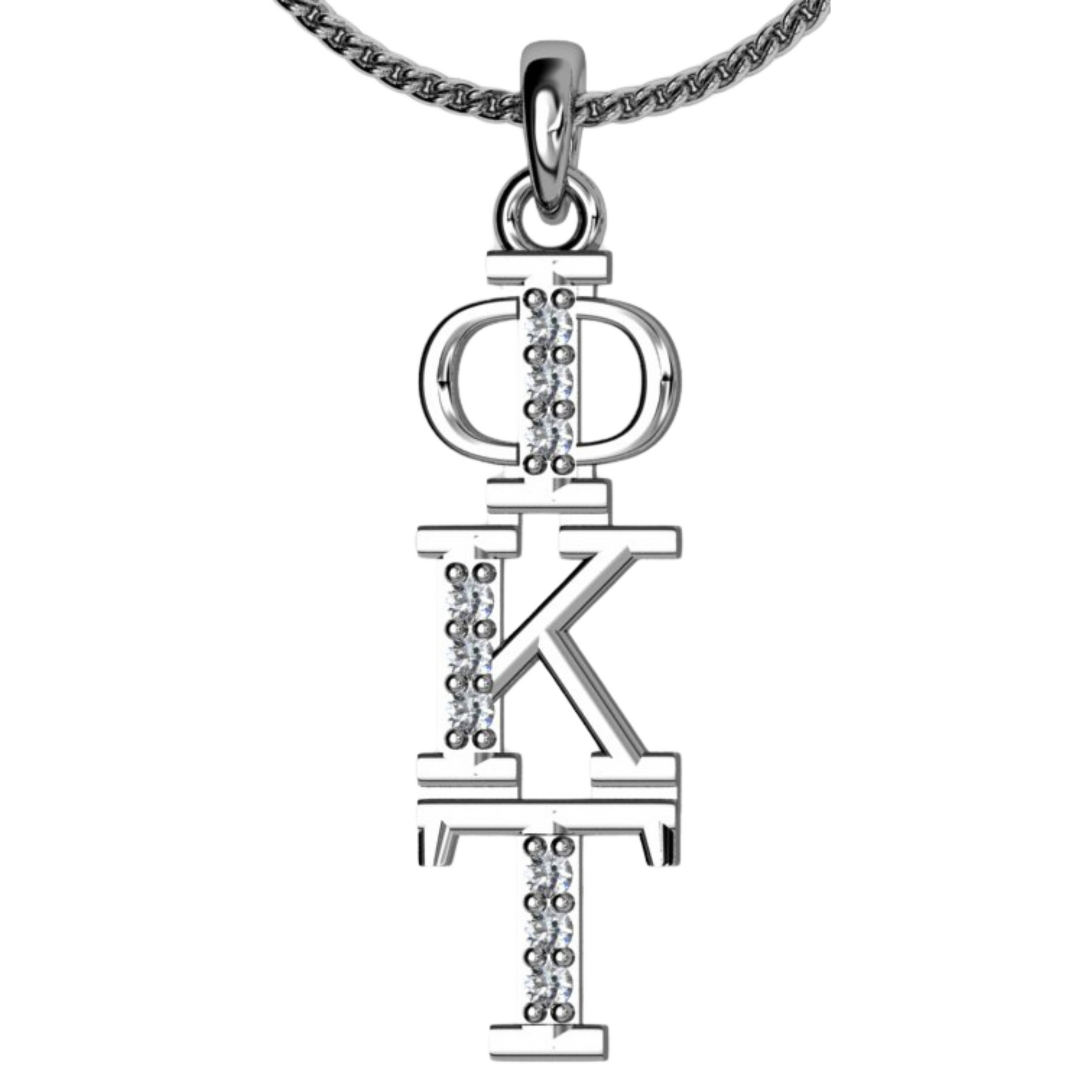 Made out of sterling silver & lab created diamonds. It’s designed and created exclusively by our company, each letter is approximately 1/4″ tall and includes a chain loop, Silver Chain sold separately.