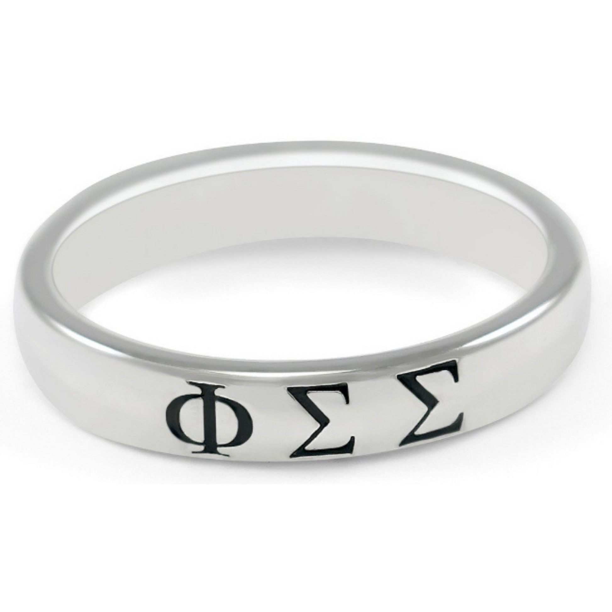 Phi Sigma Sigma women sterling silver ring with Greek letters finished in black enamel. Coated with rhodium for a smooth and lasting shine.