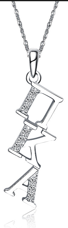 Made out of sterling silver & lab created diamonds. It’s designed and created exclusively by our company, each letter is approximately 1/4″ tall and includes a chain loop, Silver Chain sold separately.
