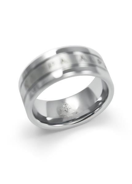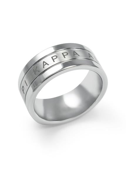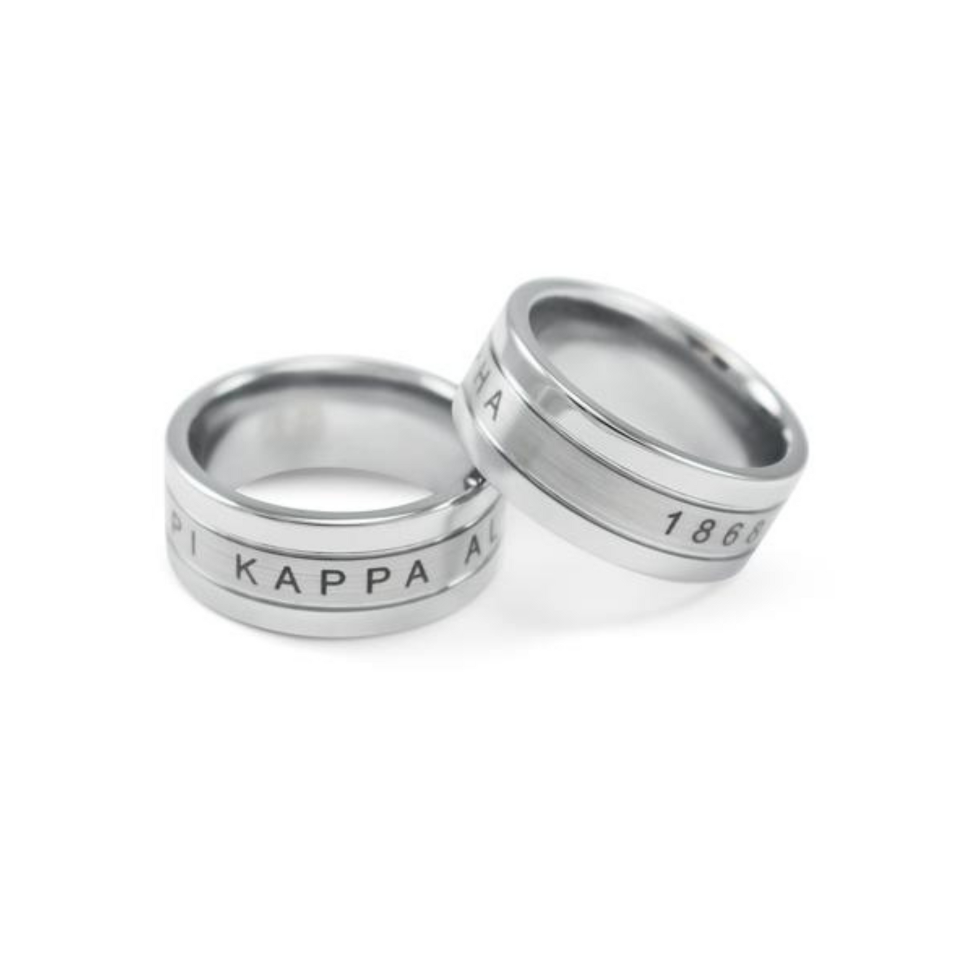 Solid Tungsten construction with a nice brush-finish in the center. Precision laser etched Sigma Nu letters.