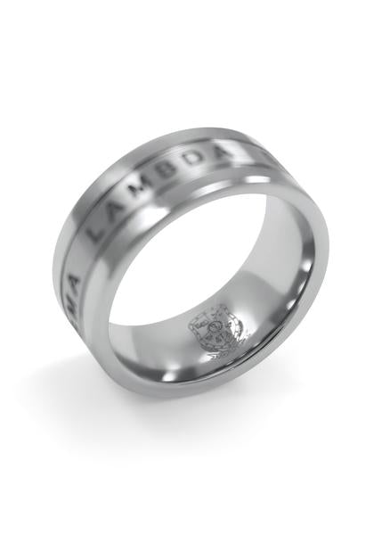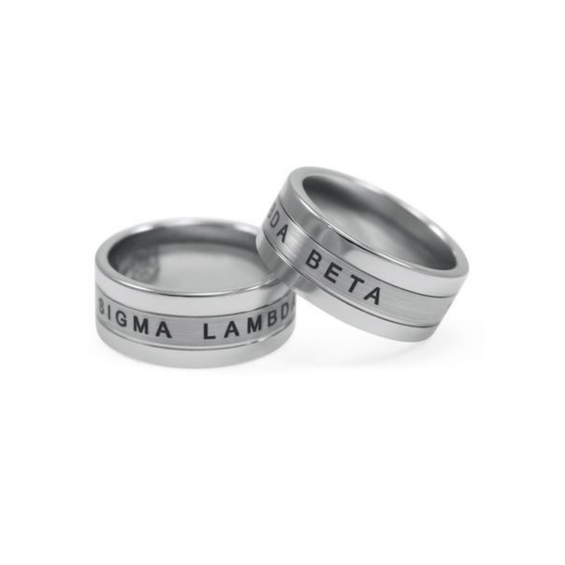Solid Tungsten construction with a nice brush-finish in the center. Precision laser etched Sigma Nu letters.