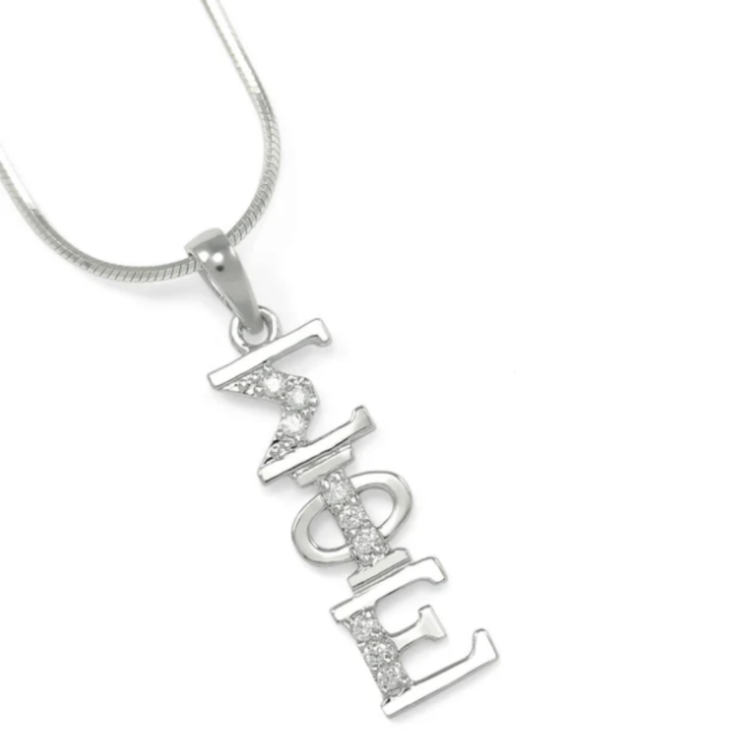 Made out of sterling silver & lab created diamonds. It’s designed and created exclusively by our company, each letter is approximately 1/4″ tall and includes a chain loop, Silver Chain sold separately.