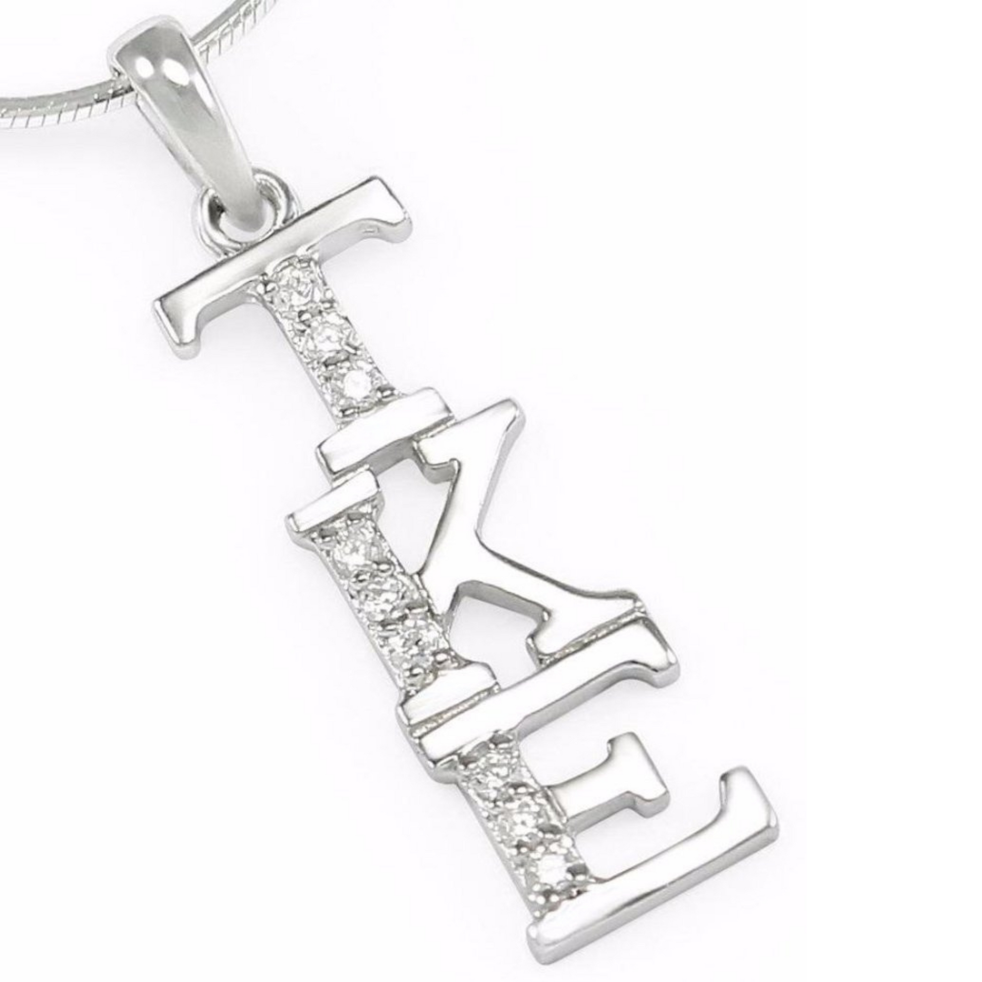 Made out of sterling silver & lab created diamonds. It’s designed and created exclusively by our company, each letter is approximately 1/4″ tall and includes a chain loop, Silver Chain sold separately..
