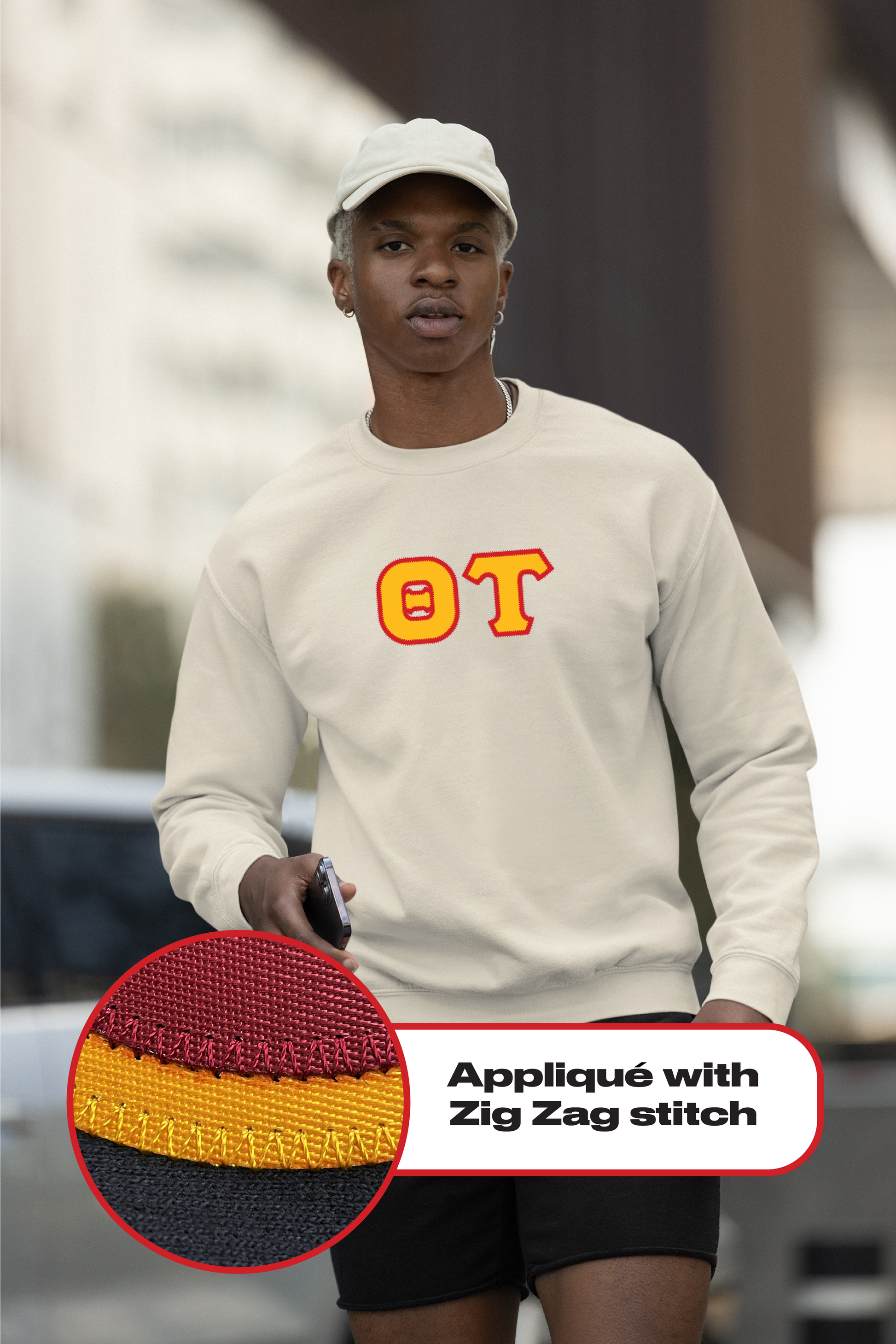 Each sweatshirt is made with laser-cut premium twill fabric and securely stitched using the classic double zig-zag embroidery. The letters are NOT heat pressed on, they are sewn on.