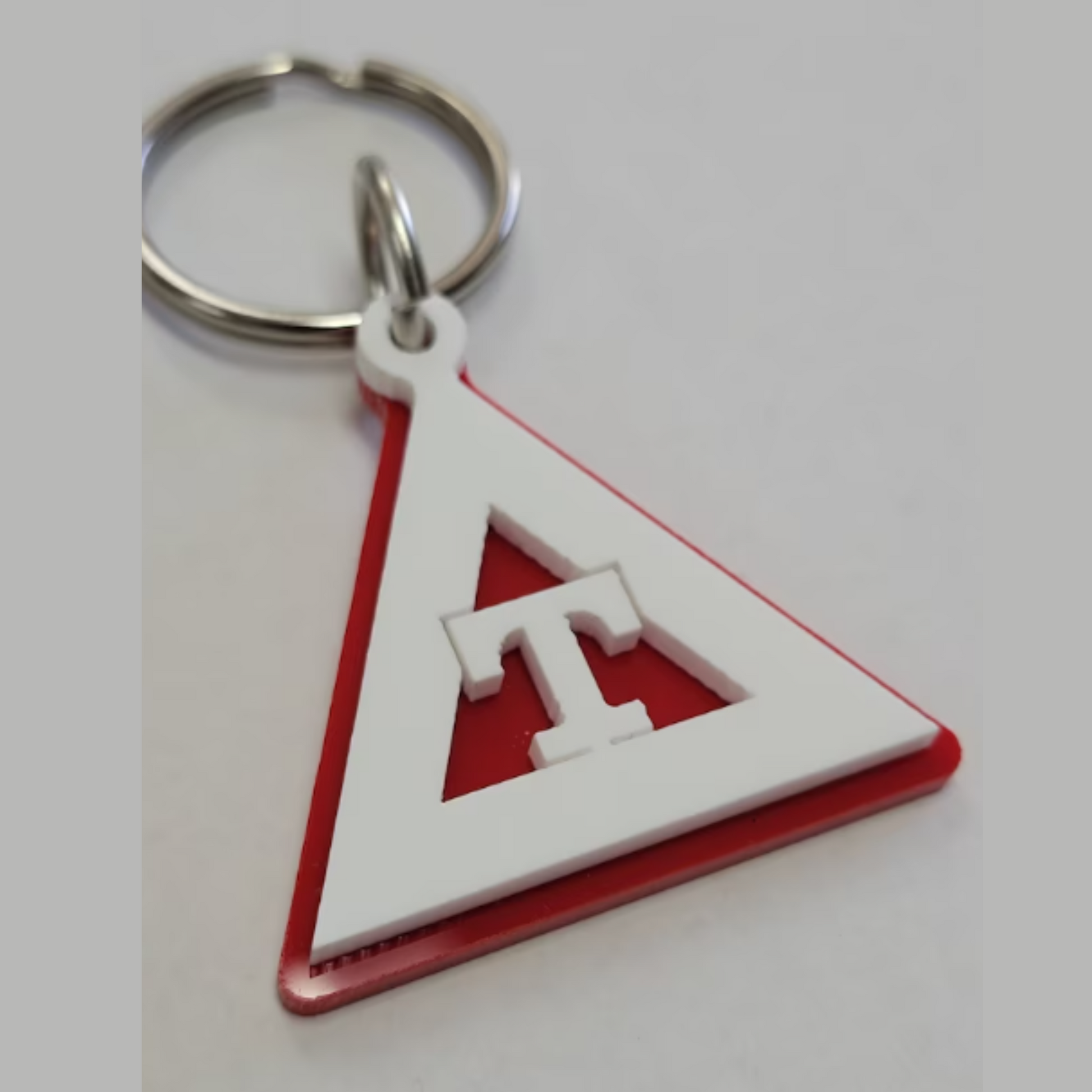 Triangle Fraternity Key Chain. Laser cut Greek letters on double layer hard plastic with Fraternity colors in mind.