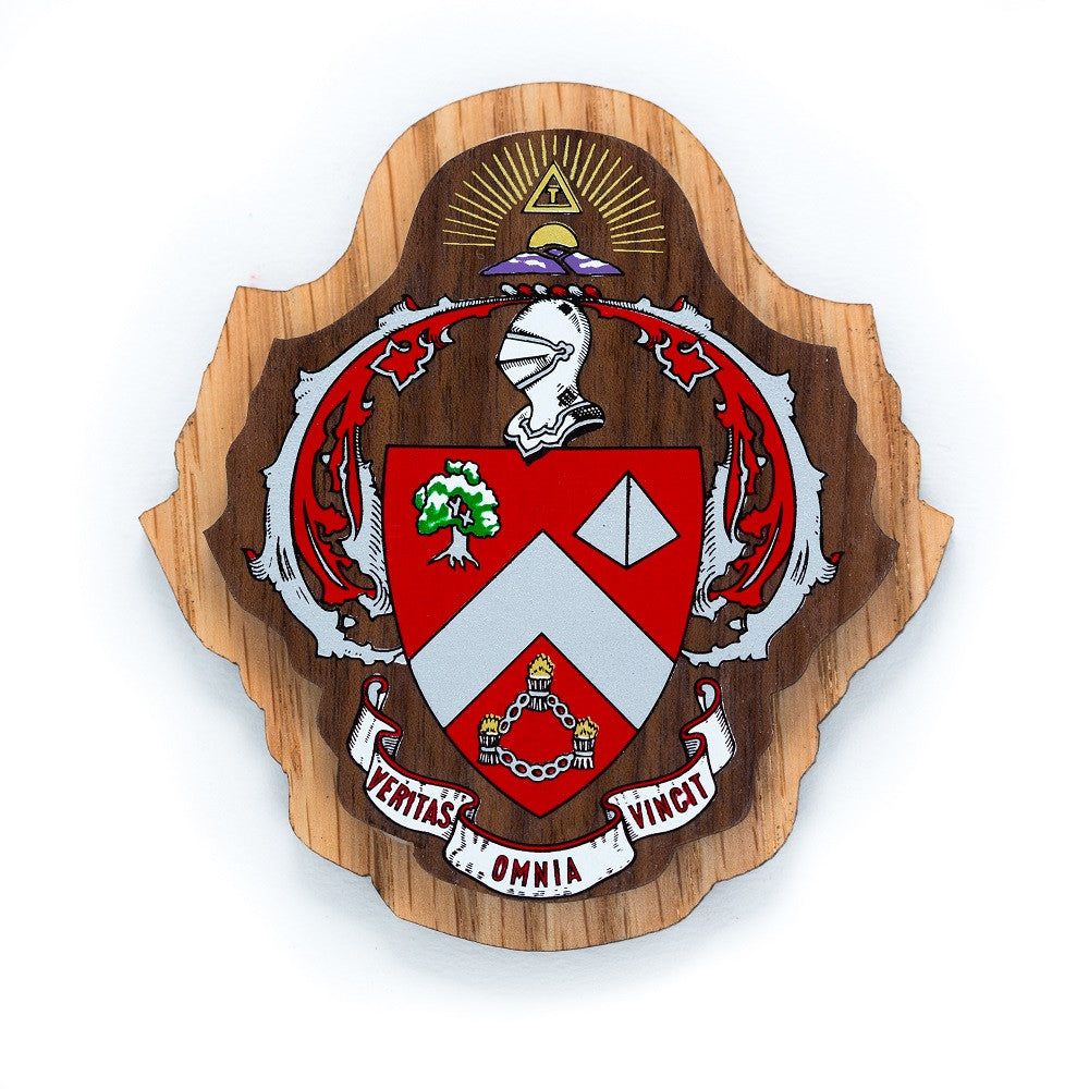 Organization raised wood crest with 3m tape adhesive backing for easy application to any paddles, doors or boxes. Holds just as good as glue when applied to a clean smooth surface.